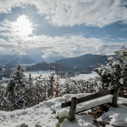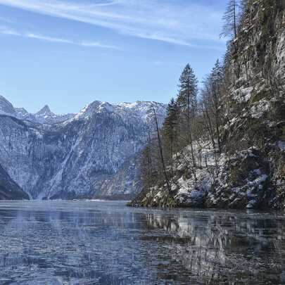Der Aussichtspunkt Malerwinkel ist im Winter auf einem geräumten Wanderweg leicht zu erreichen. Von hier bietet sich ein fantastischer Ausblick über den Königssee bis nach St. Bartholomä.