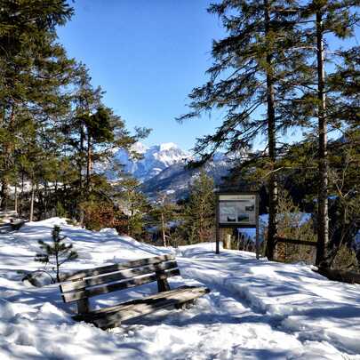 Vom Gasthaus Schwarzeck im Ortsteil Hochschwarzeck in Ramsau führt ein breiter Weg in angenehmer Steigung durch den Wald hinauf zum Hirschkaser. Der Weg wird im Winter präpariert und ist meist von einer festen Schneedecke bedeckt. Kurz vor der Bergstation der Hochschwarzeck Bergbahn zweigt in einer Kehre der Weg zum Toten Mann und der Schutzhütte Bezoldhütte ab – ein lohnenswerter Abstecher. Zurück am Hauptweg führt der Weg an der Bergstation und dem Start der Rodelbahn Hirscheckblitz vorbei zum Hirschkaser mit großer Sonnenterrasse. Mit dem Schlitten, den Sie vor Ort ausleihen können, gelangen Sie in rasanter Fahrt zum Ausgangspunkt der Winterwanderung.